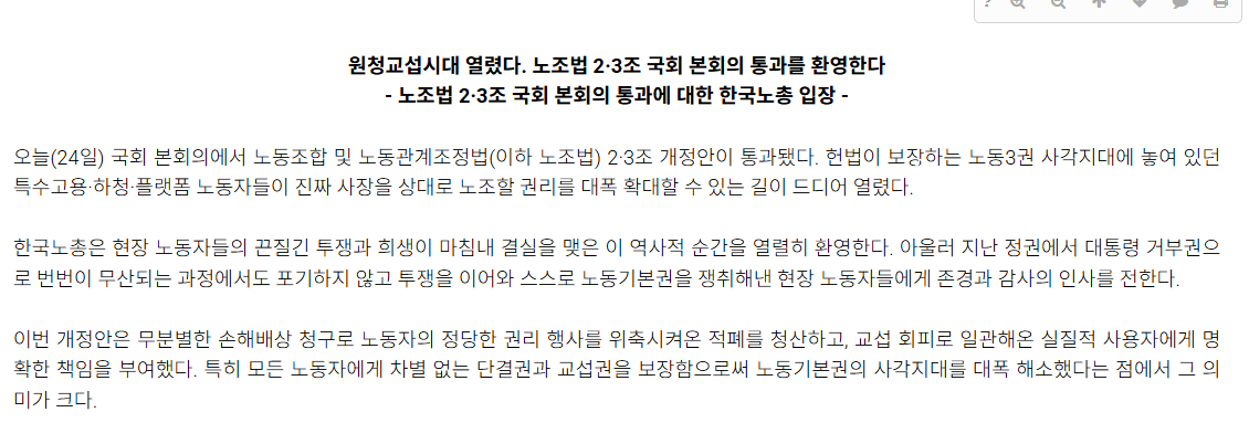 노동계는 “역사적인 결실”이라며 크게 환영했습니다. 민주노총과 한국노총 모두 오랜 시간 투쟁 끝에 노동자의 권리를 제도적으로 보장받게 된 점에 의미를 두었습니다.